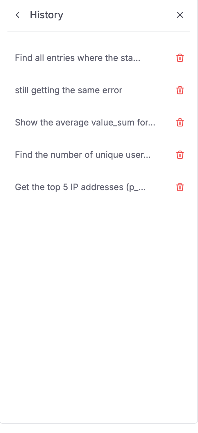 Generate with AI> "Show all 5xx errors grouped by host in the last hour." - Fix a query: Paste a broken query, then prompt, "Fix this query, it's giving a syntax error."