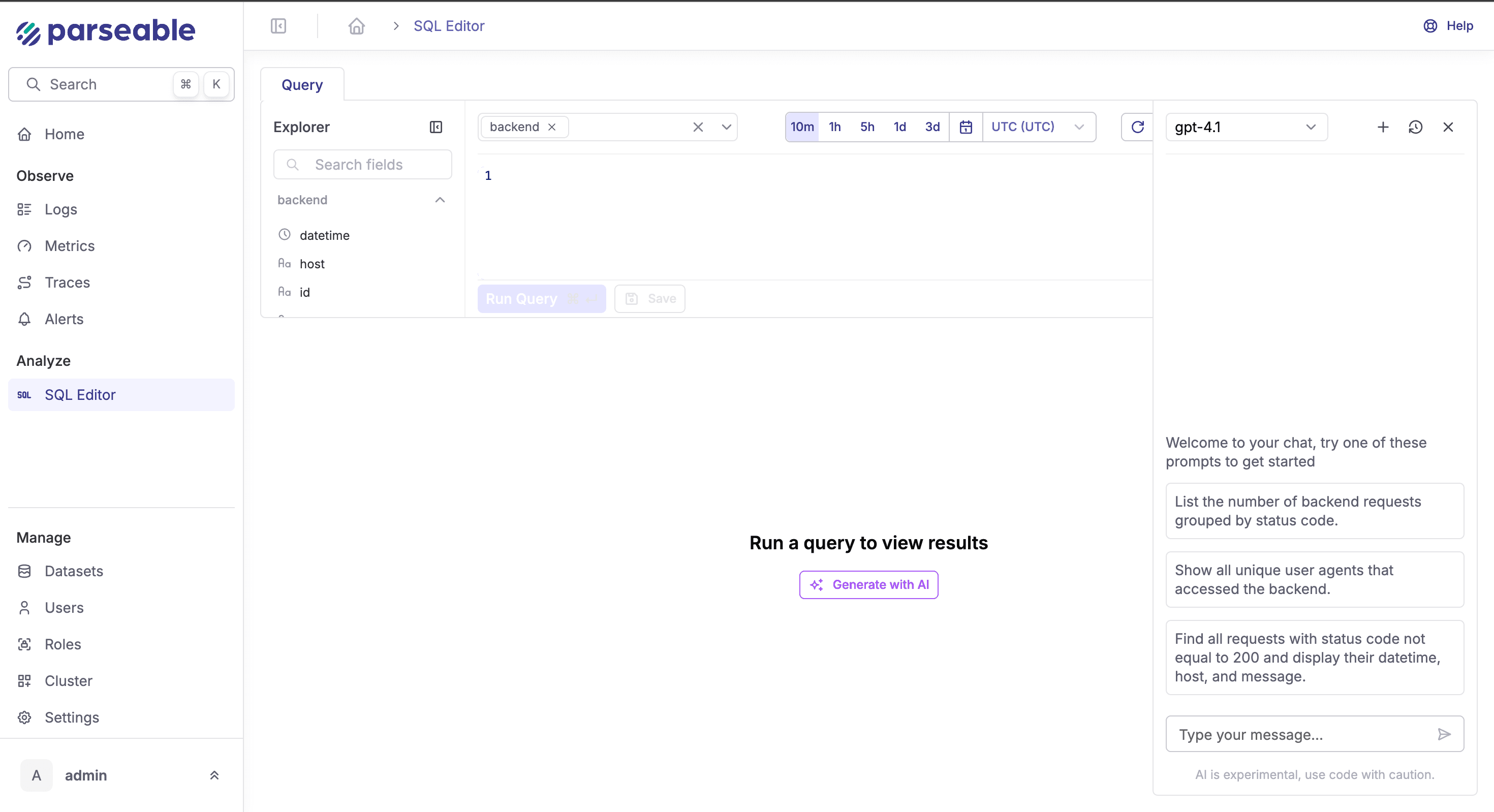 Parseable's LLM based query builder allows you to generate SQL queries based on your natural language query. This feature is available in the Prism and can be accessed from the SQL editor. It can also help with fixing your queries by suggesting corrections based on the query you have written.