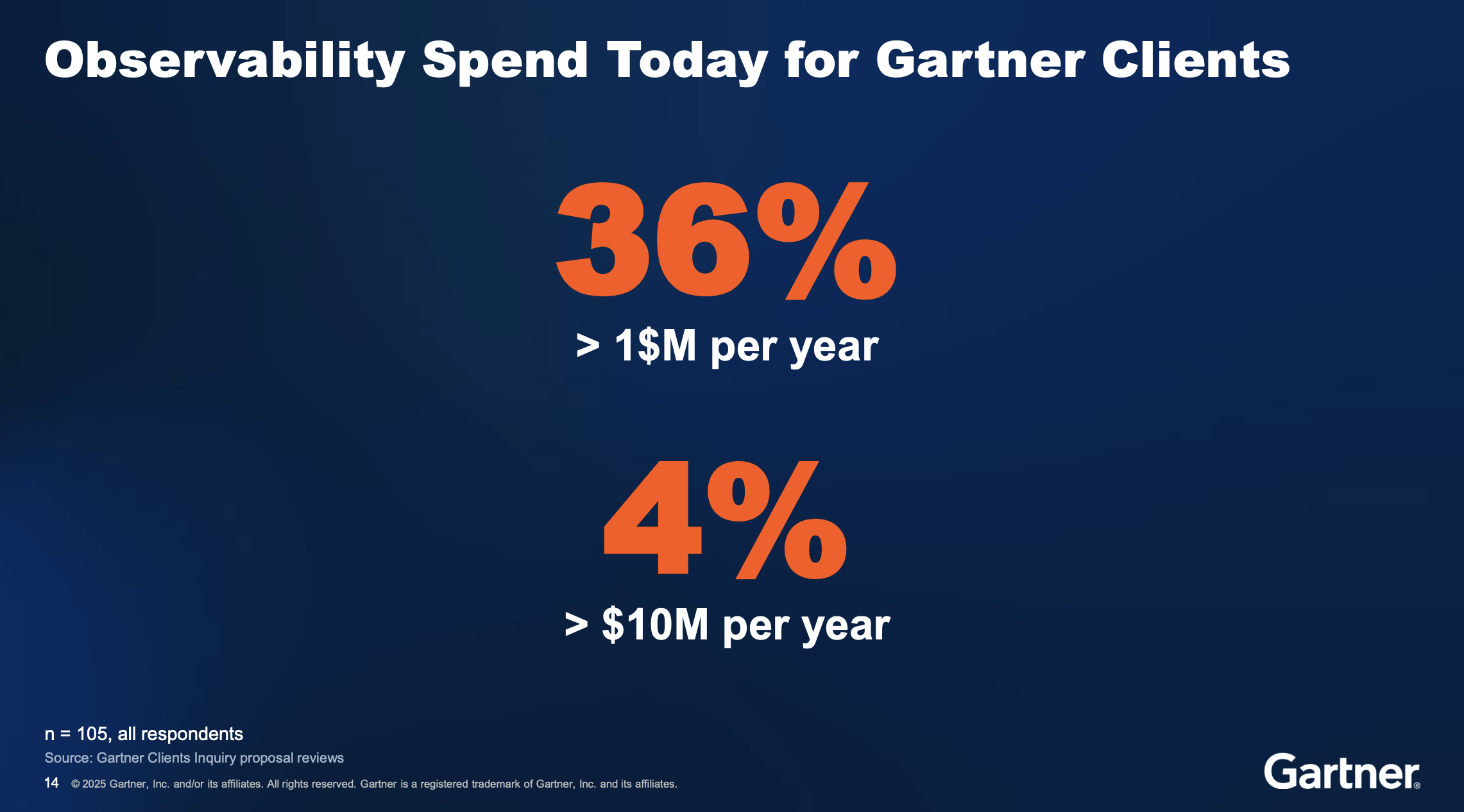 According to a recent Gartner webinar, observability spending is rapidly rising, with 36% of enterprises now investing over $1 million annually, a figure growing by as much as 40% year-over-year. Over half of these costs are dedicated solely to log management, and complexity continues to mount as many organizations juggle 10-20 or more observability tools simultaneously.