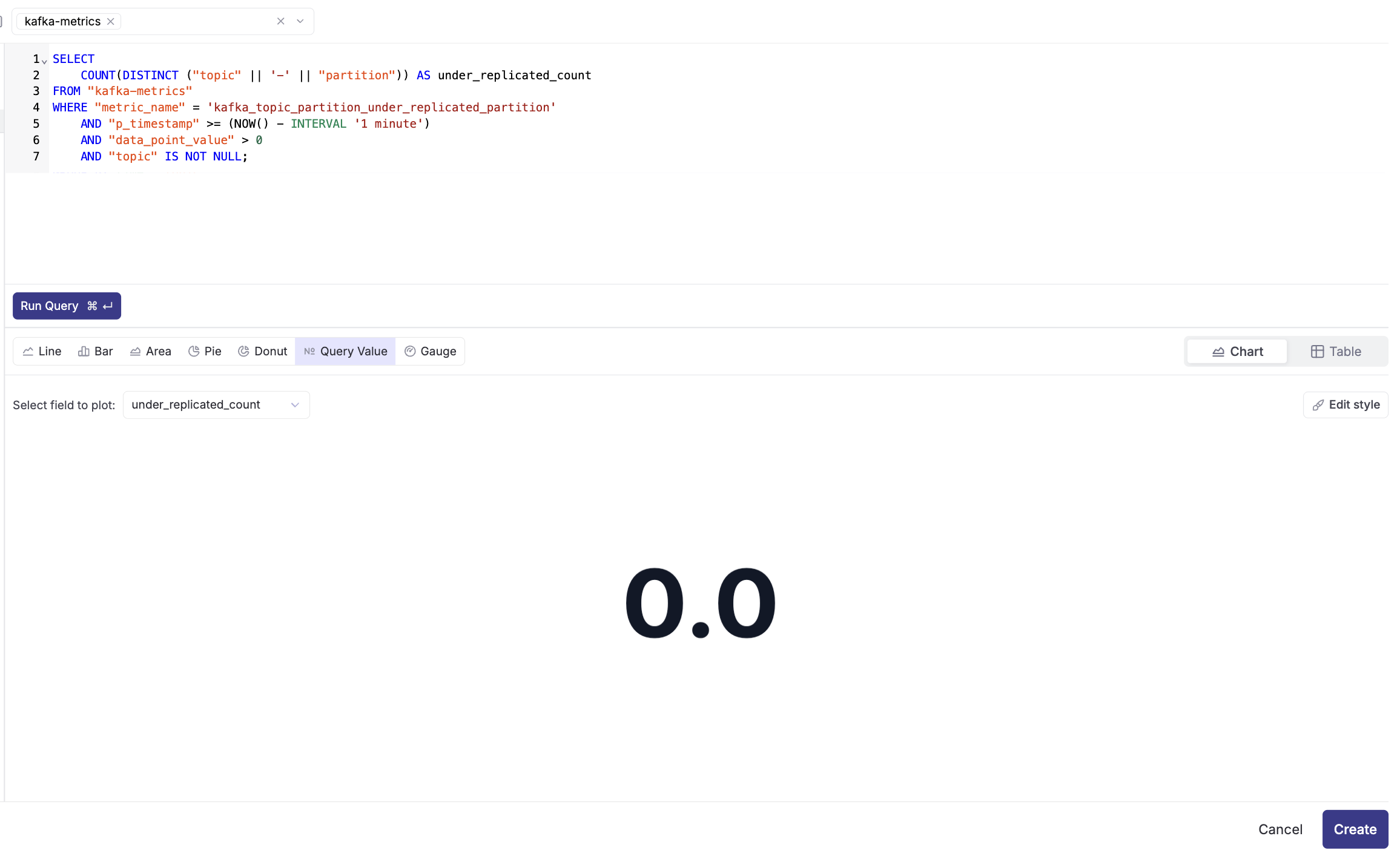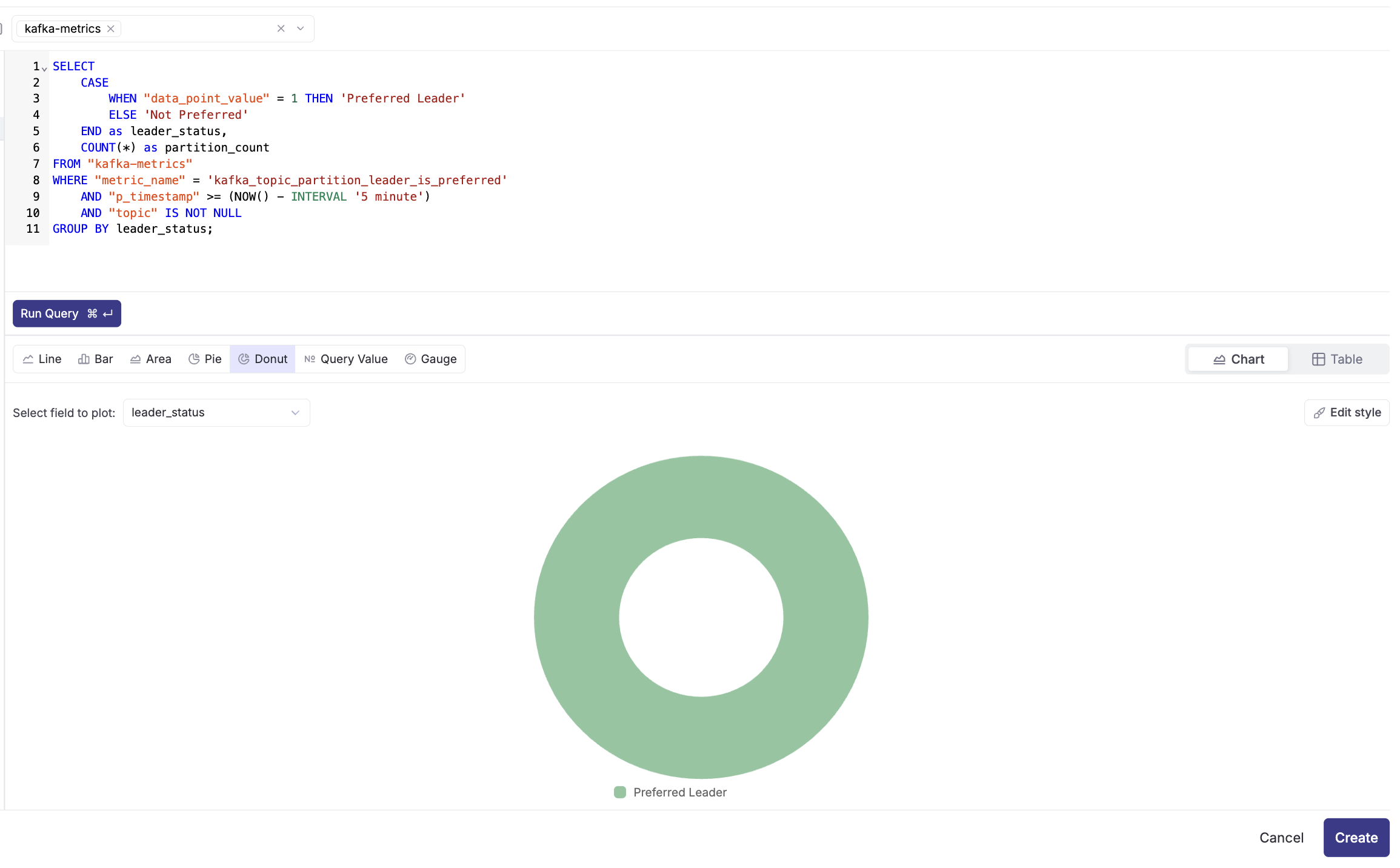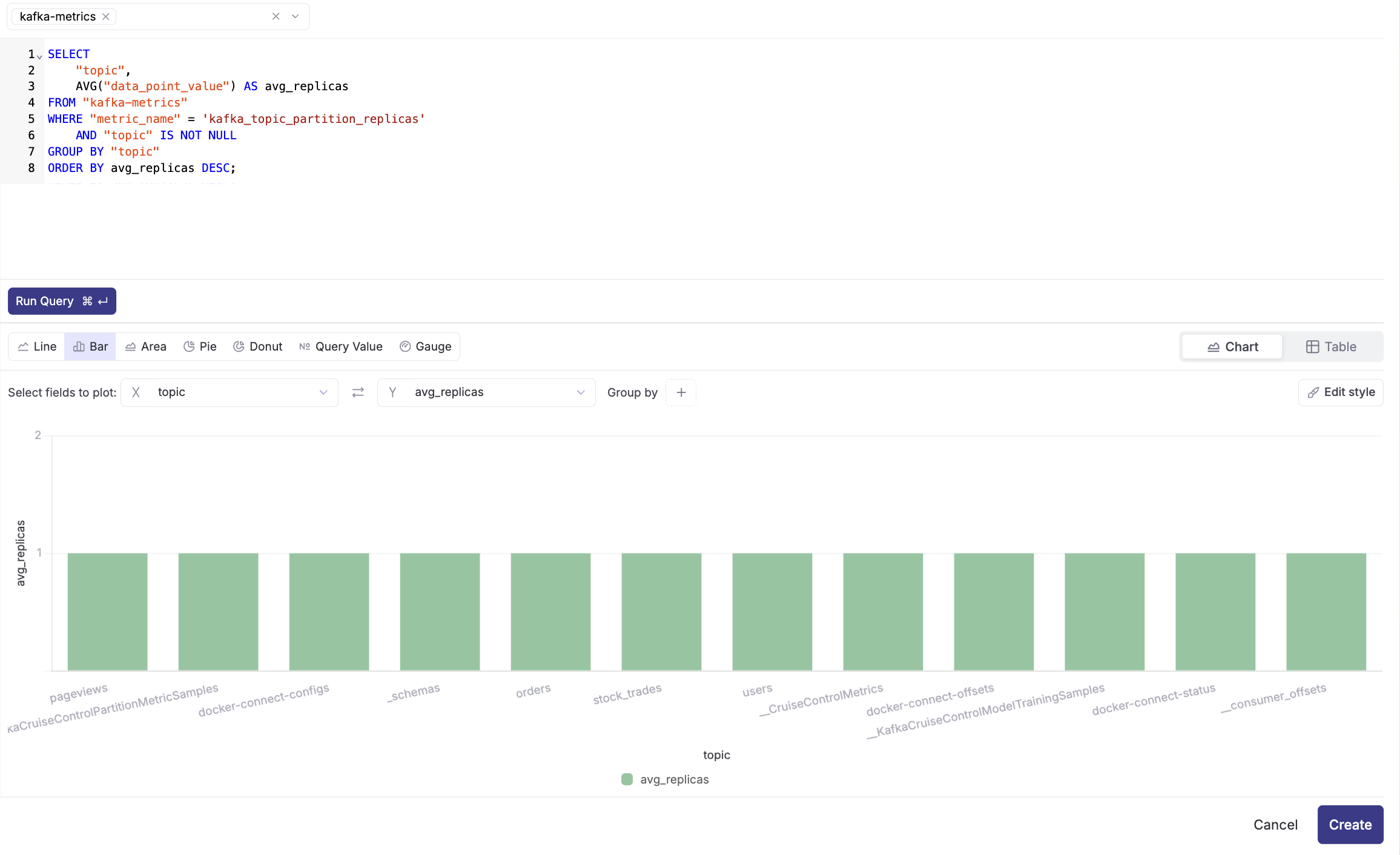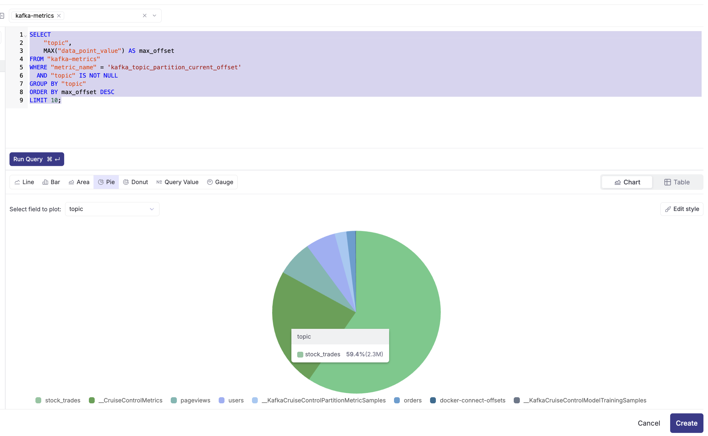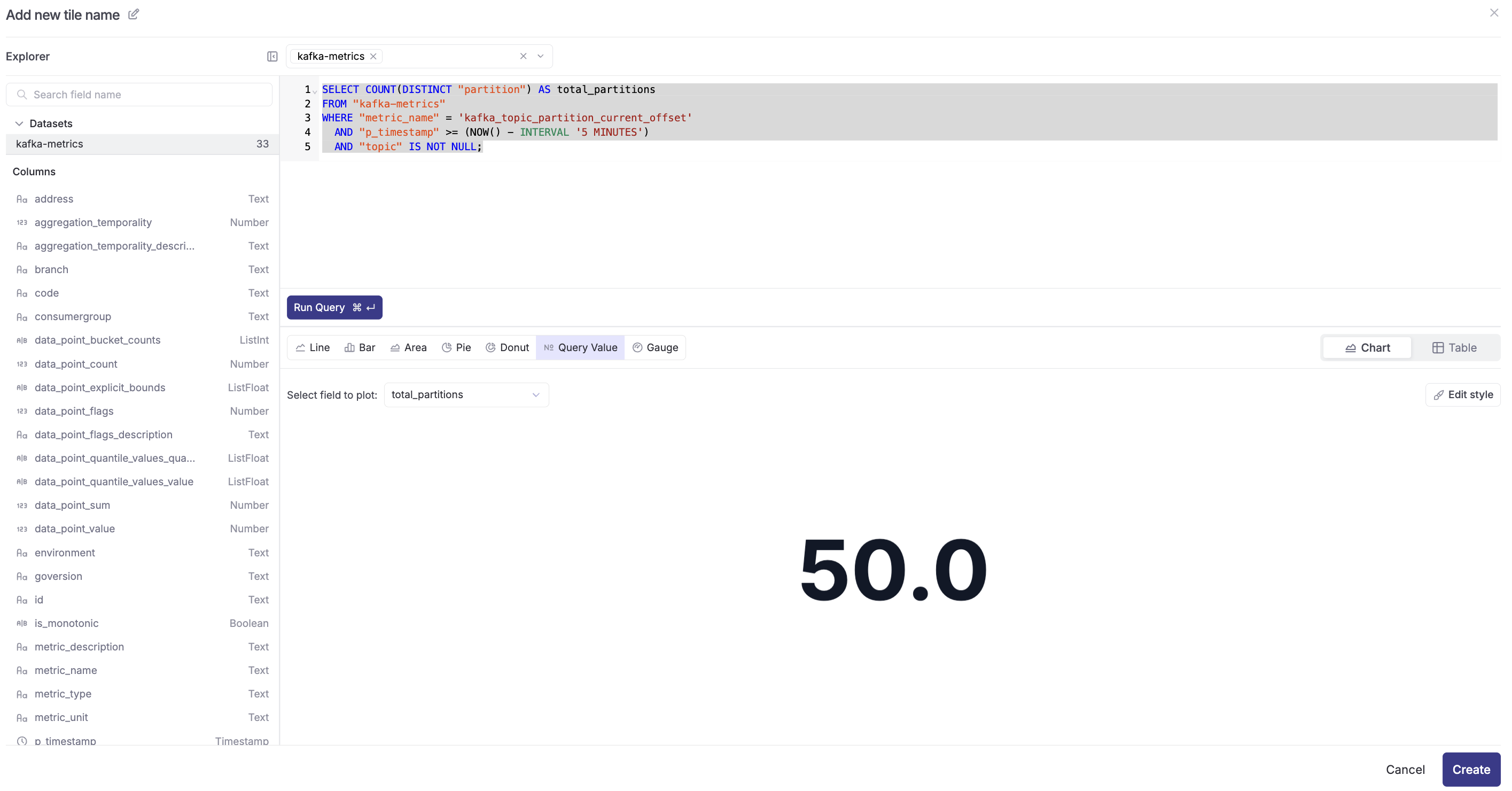 - Select the "kafka-metrics" dataset from the dropdown