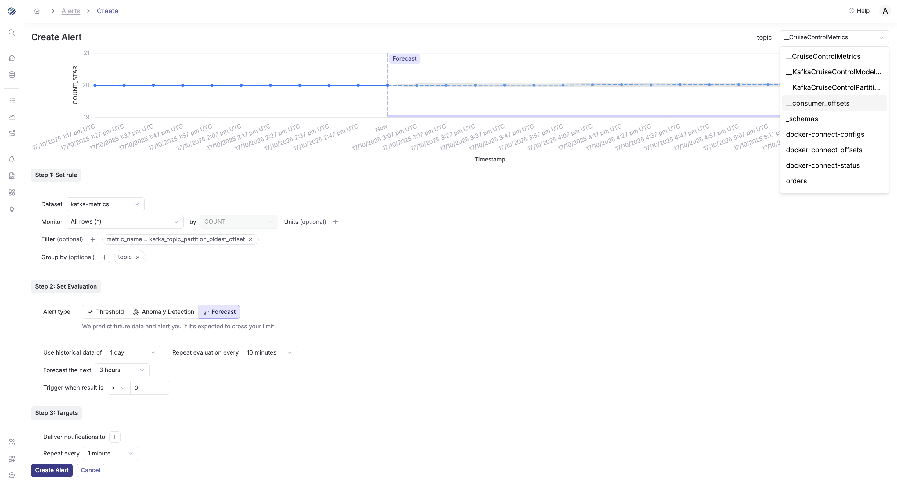 Parseable provides three types of alerts to monitor your Kafka metrics: Threshold, Anomaly Detection, and Forecast. Let's set up one of each type.