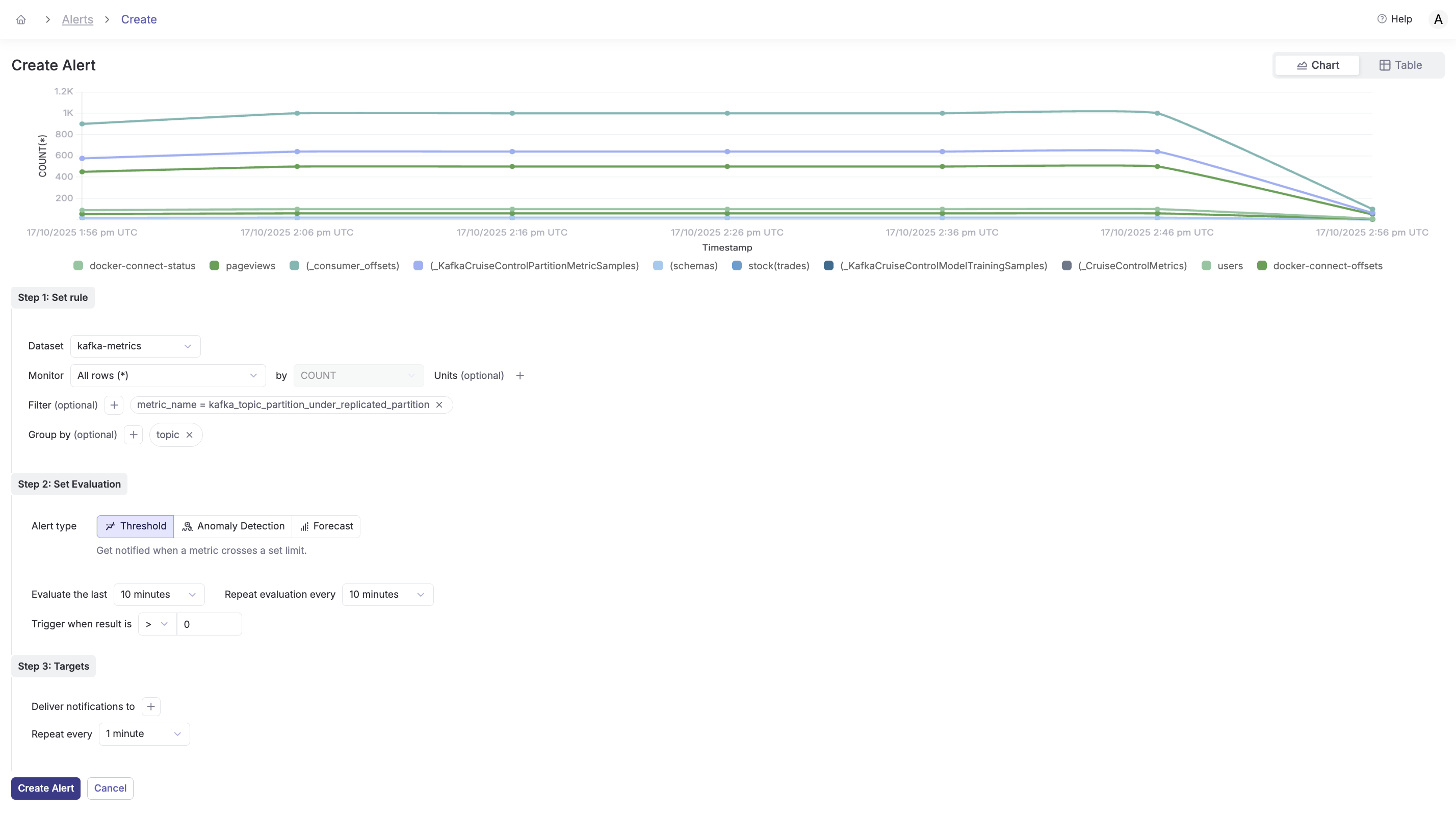 Threshold alerts trigger when a metric crosses a specific value. This is ideal for monitoring critical conditions like under-replicated partitions.