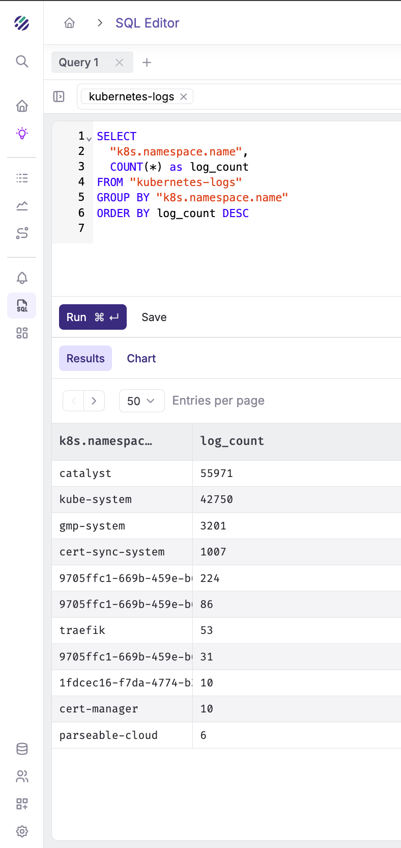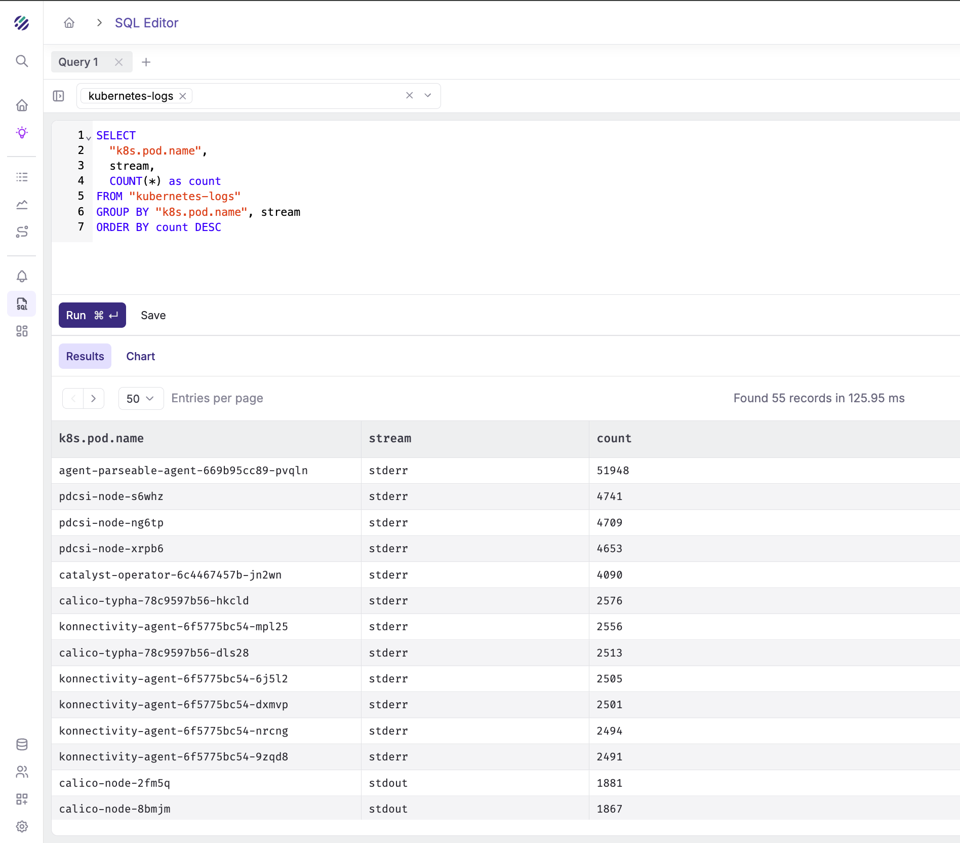 With the metadata extracted, you can run powerful SQL queries. Select your time range in the Parseable UI, then run these queries: