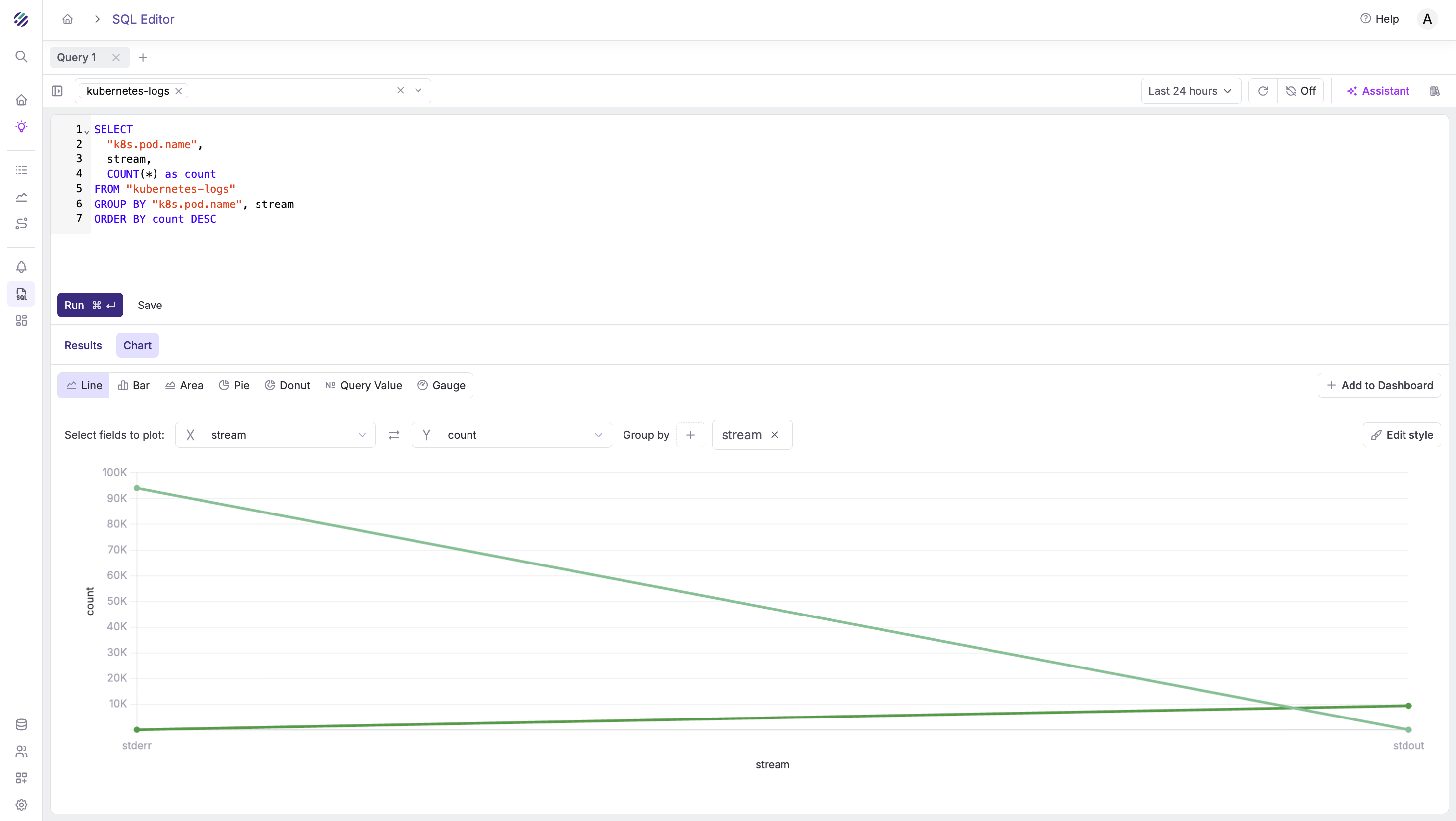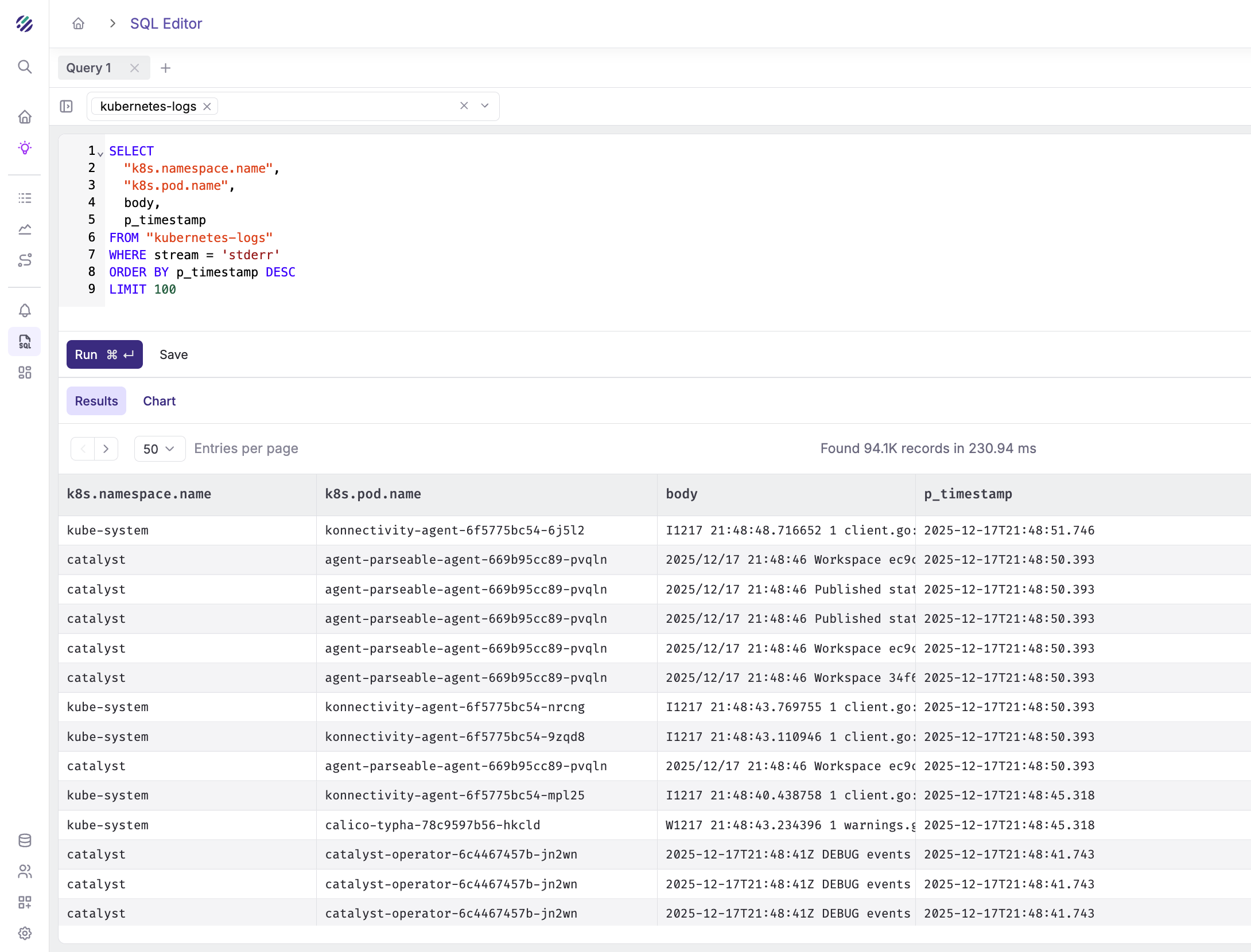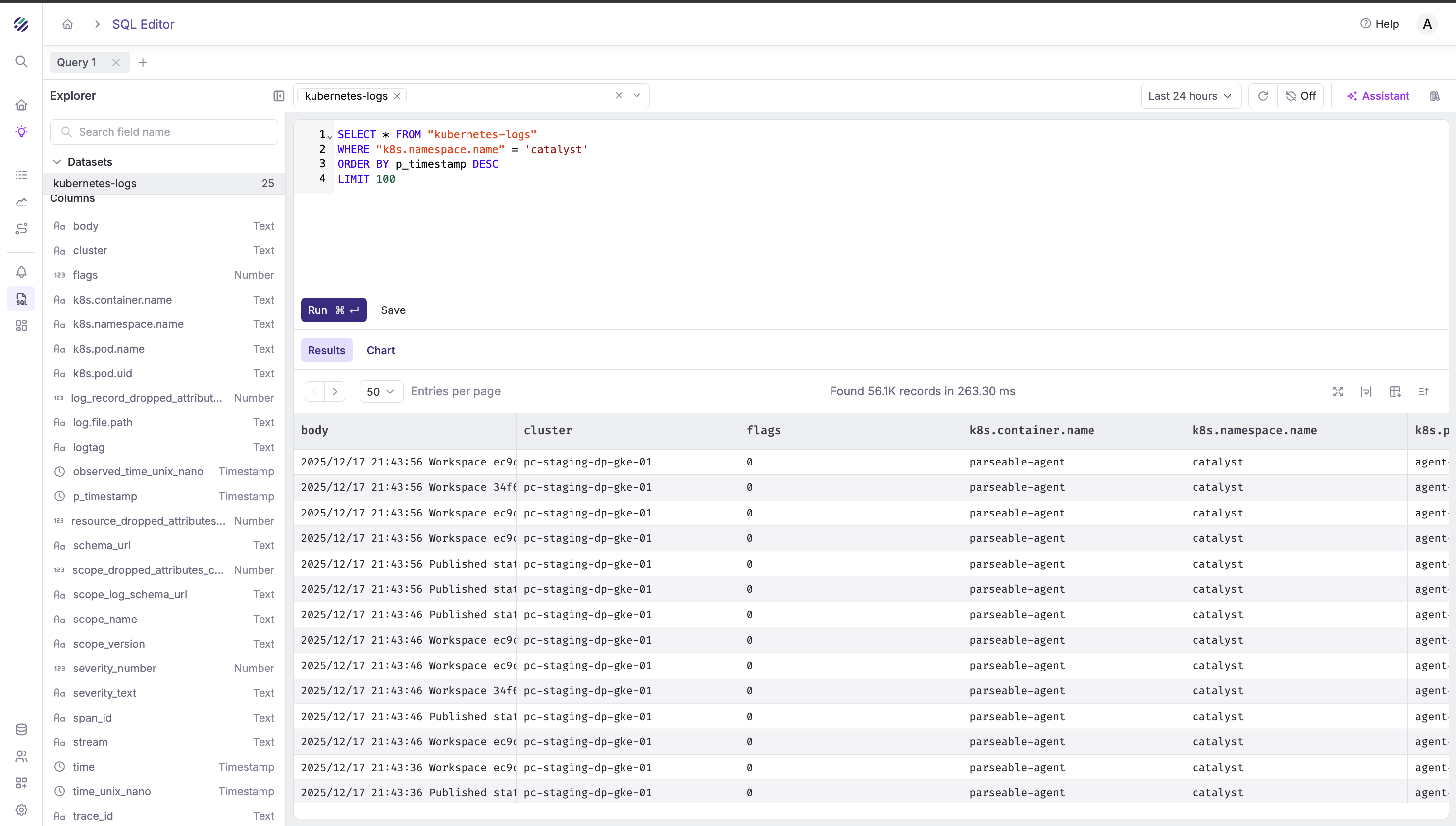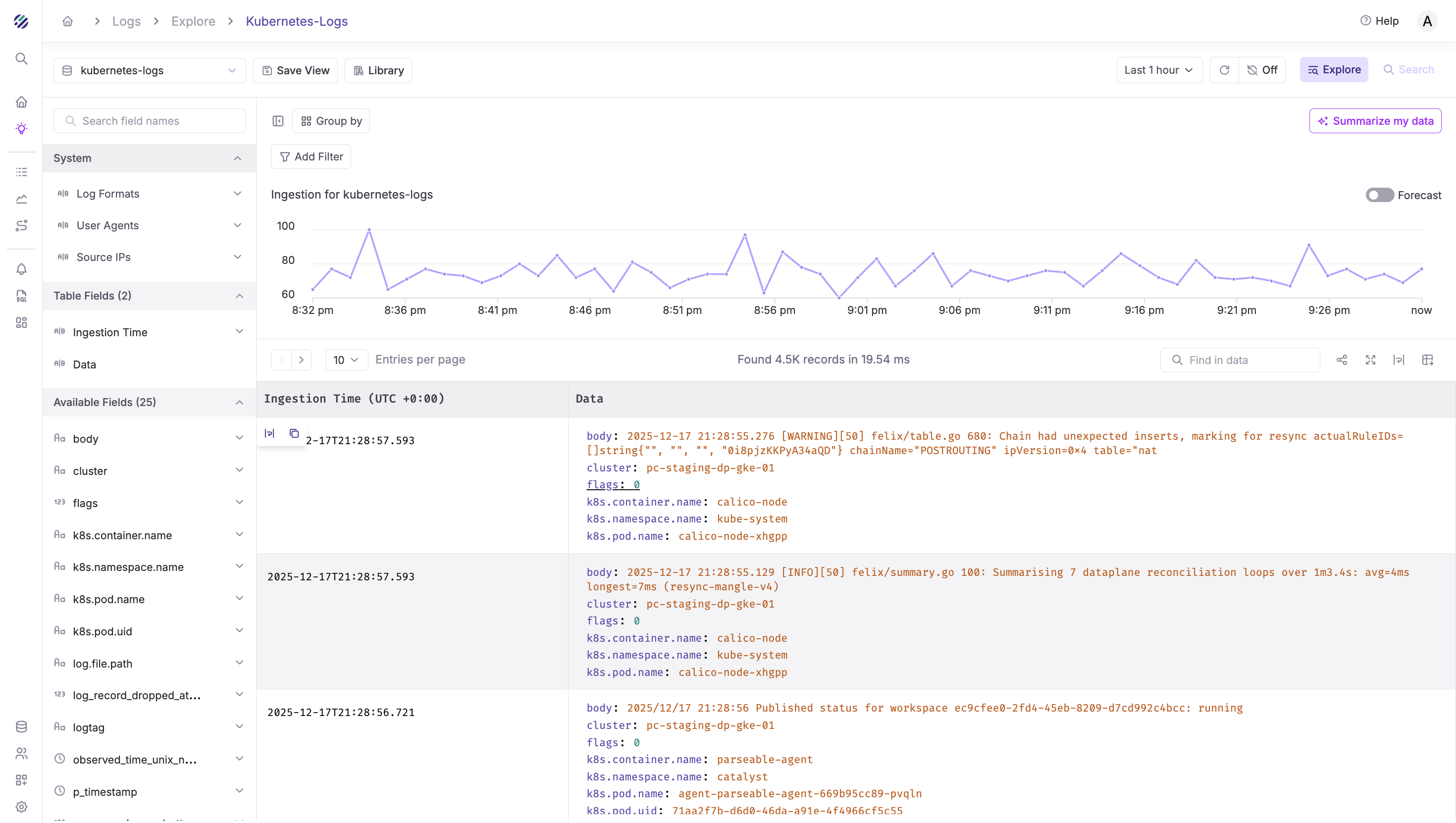 Once deployed, logs should start flowing to Parseable within seconds. Log in to your Parseable instance, navigate to the log stream you specified in the X-P-Stream header (e.g., kubernetes-logs), and you should see incoming logs with rich Kubernetes metadata.
