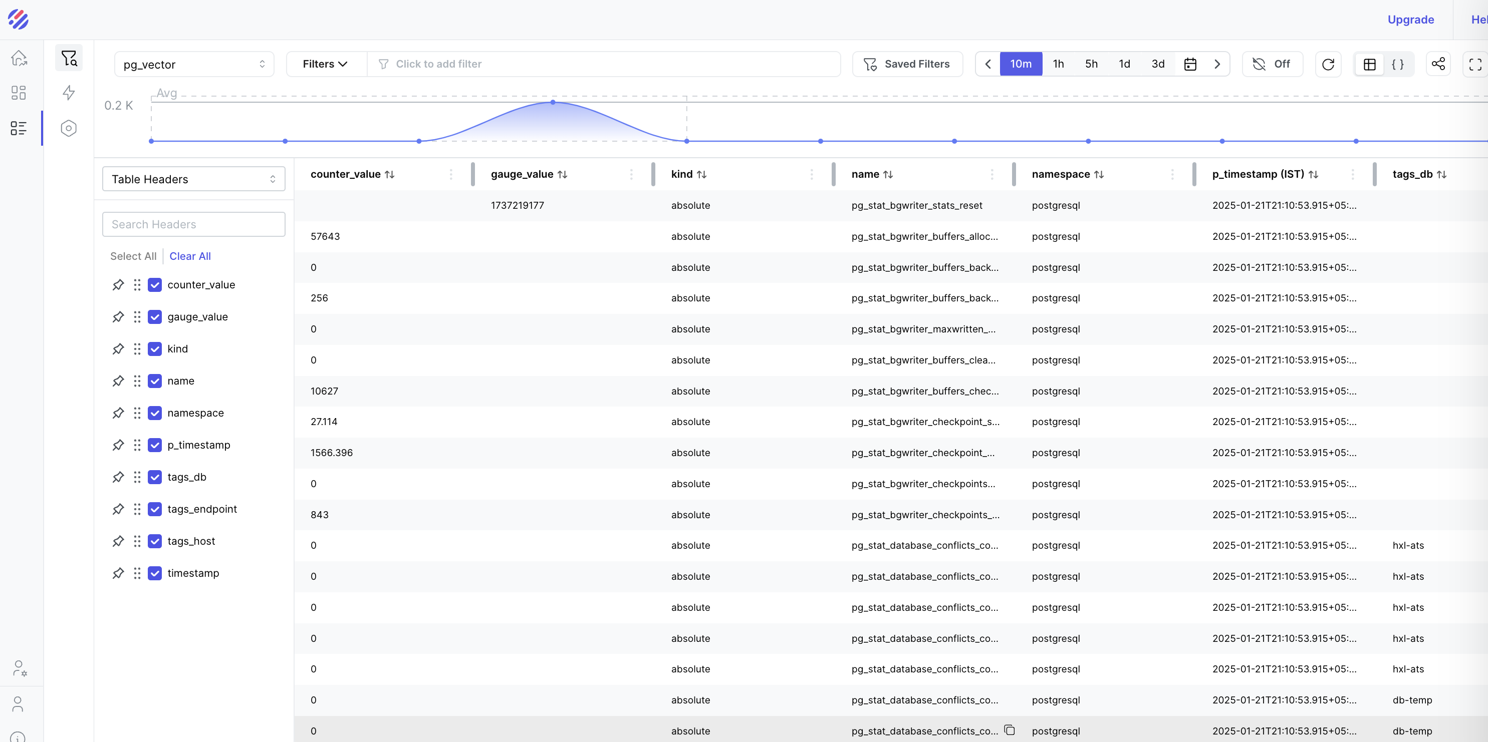 If the workflow is setup correctly, you should see the stream pg_vector as defined in the vector config file. Here you’ll see the logs / explore view. You can search, query, or sort logs from here.