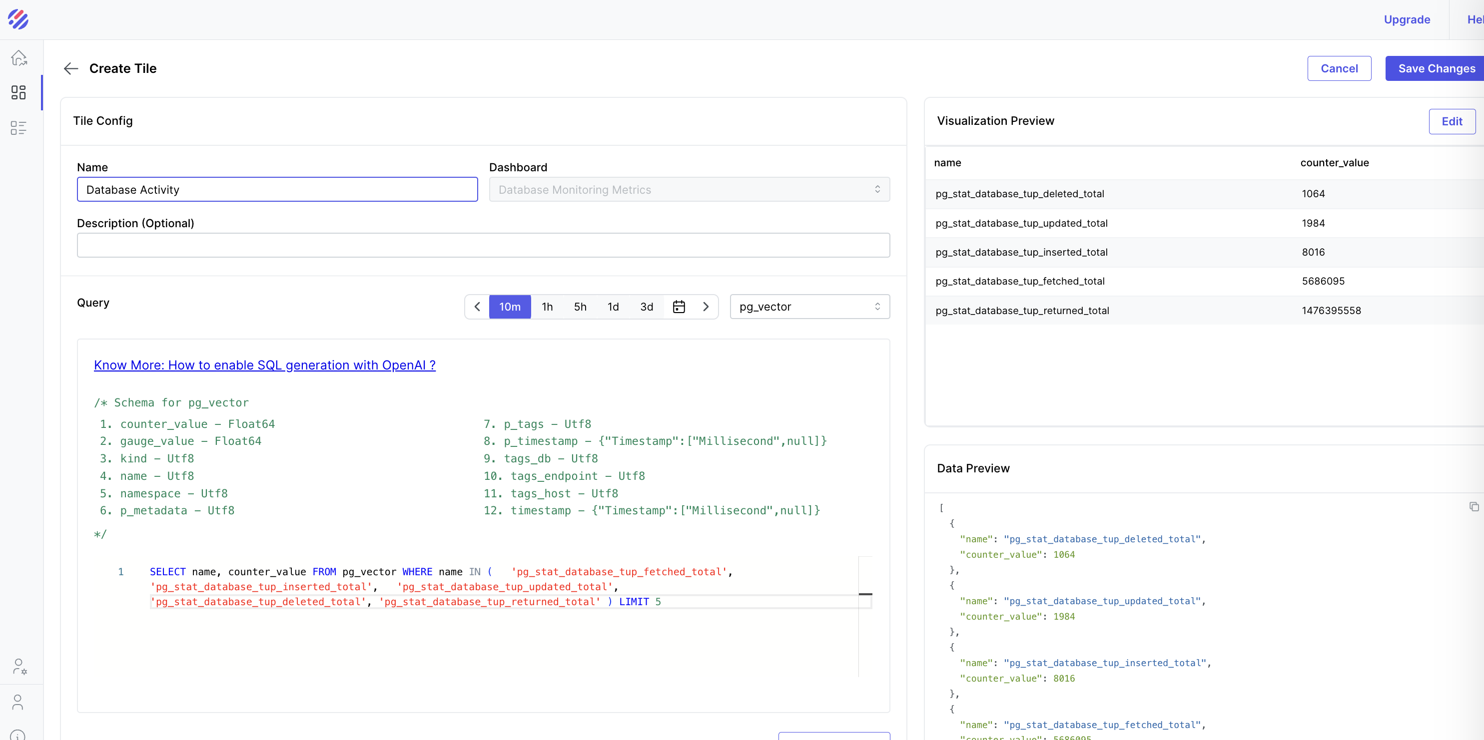 Step 2 :On clicking “Add tile“ you get a simple and intuitive query builder interface for you to write your SQL query. Click on validate query and check the visualisation preview. Here are few metrics and insights you can query to build the dashboard.