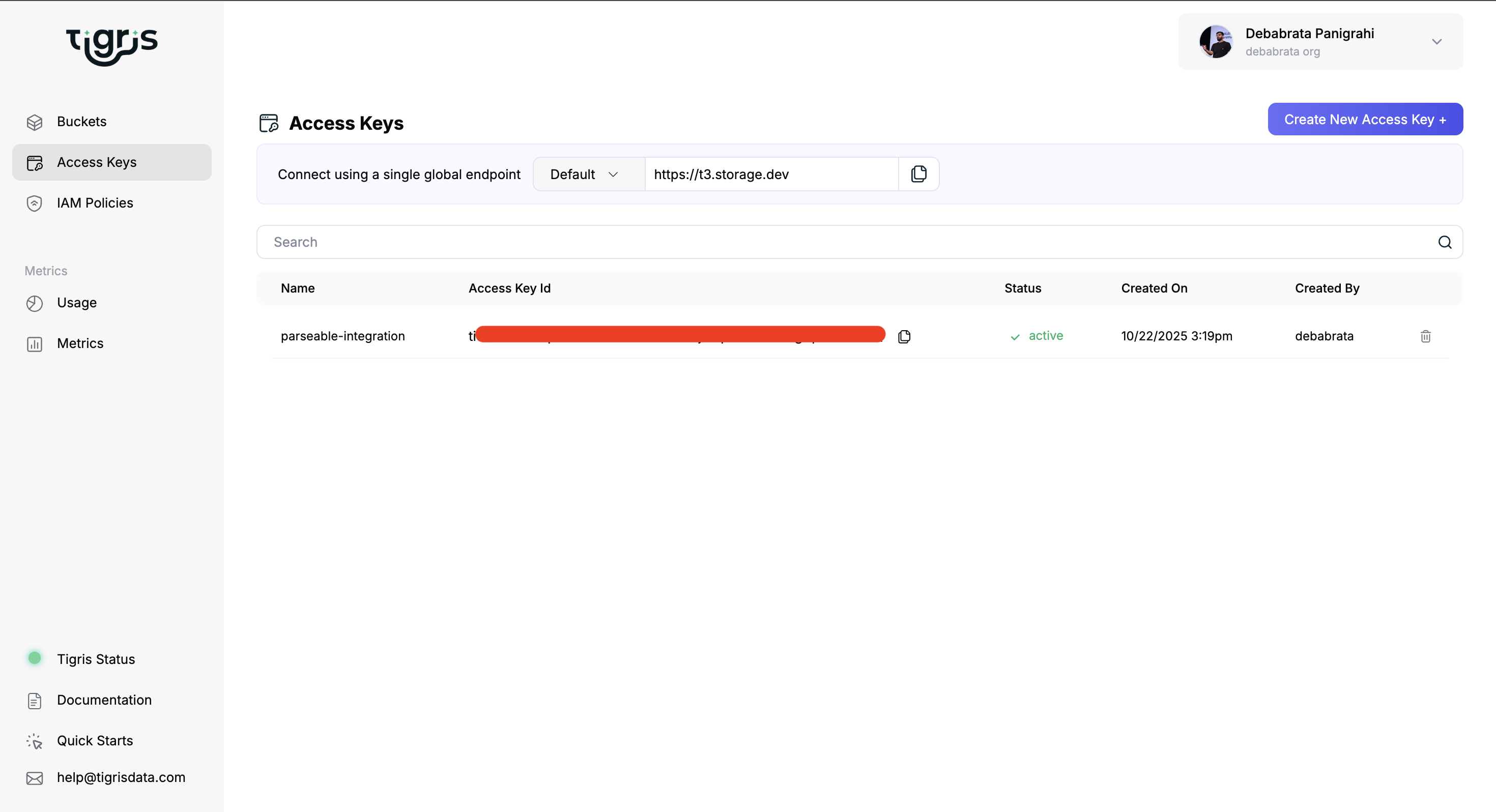 - Refer to the Tigris docs to create your account, bucket, and an access key / secret.