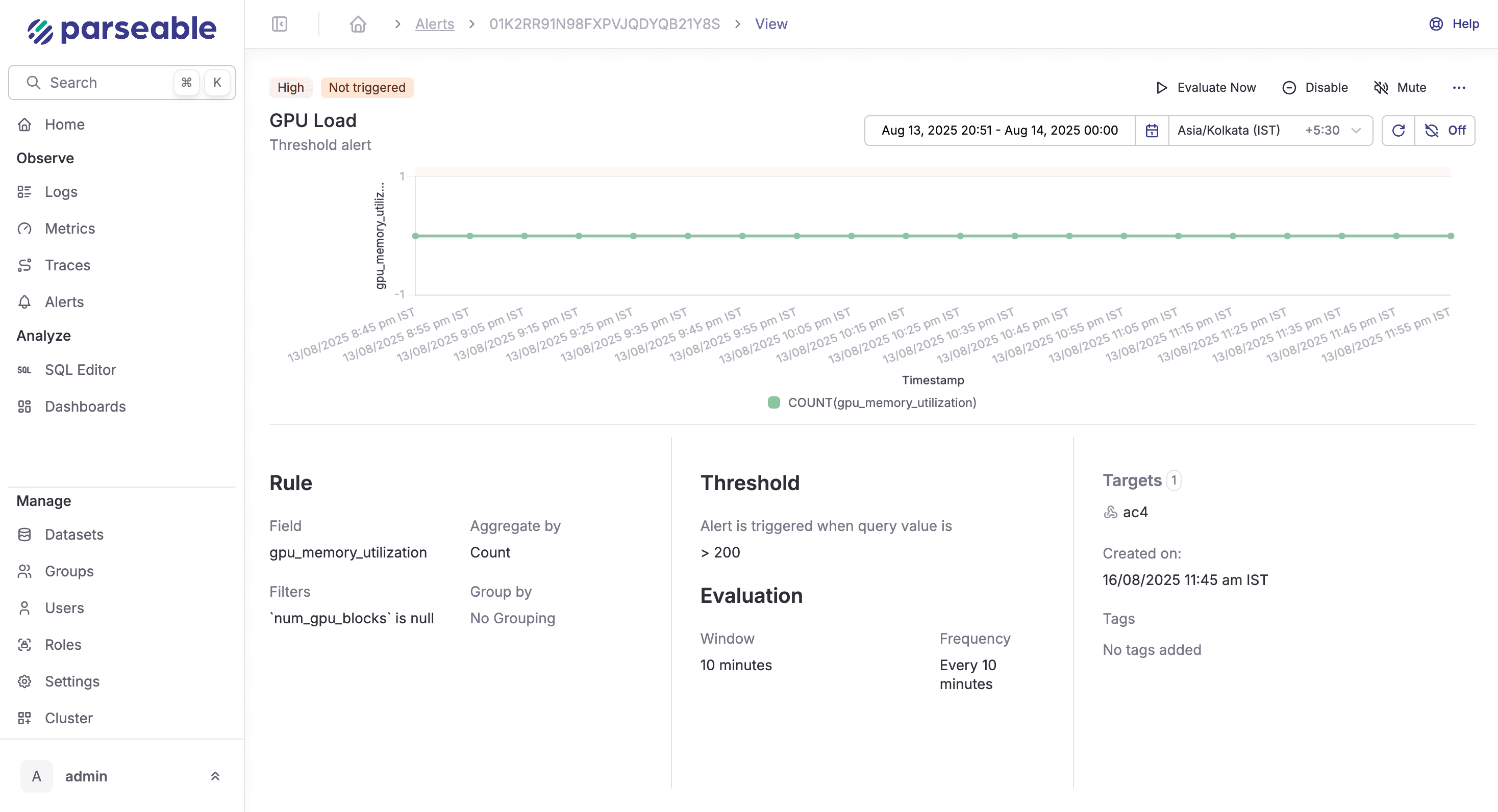 Parseable offers realtime alerting based on contents of incoming events. Each dataset can have several alerts and each alert is evaluated independently.