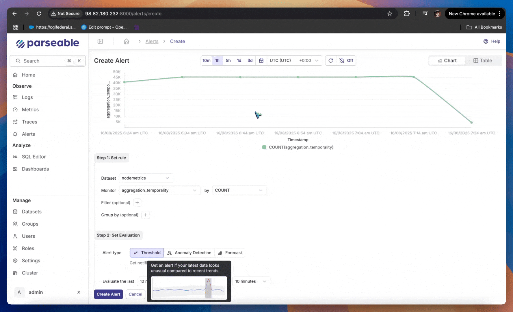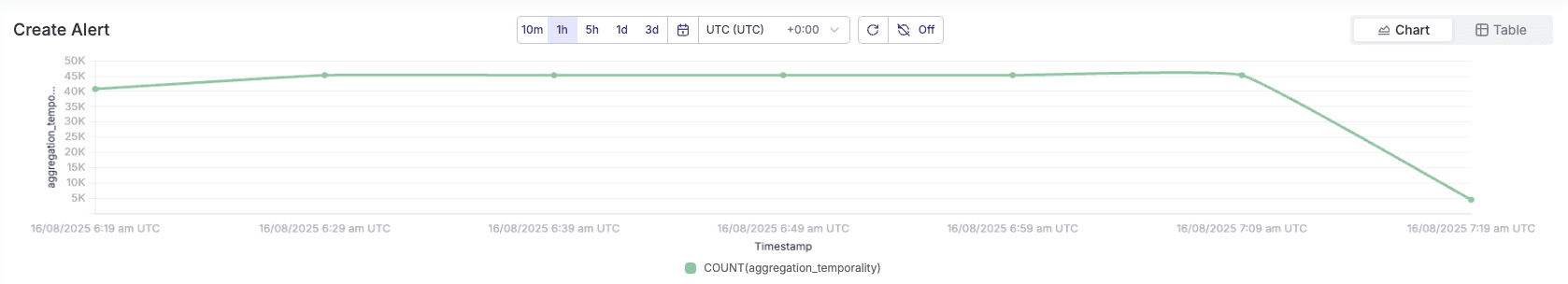 - Set the "Preview", it could be either chart or table for 10m, 1h, 5h 1d or any custom timerange.