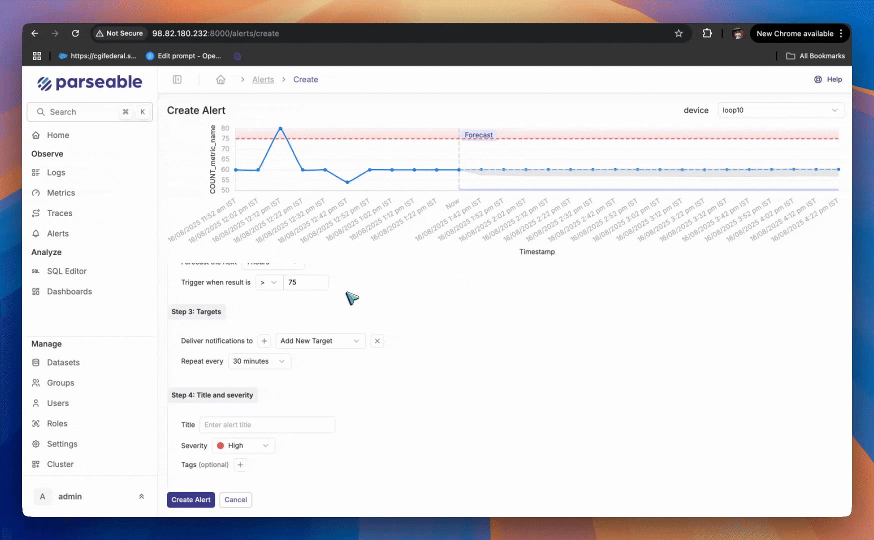 Targets are the destinations where notifications are sent when an alert is triggered. Parseable supports Webhook, Slack, and Alertmanager targets.